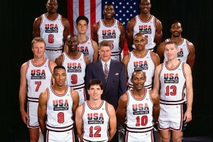 当年美国篮协率先公布了一份10人名单:乔丹、“魔术师”约翰逊、拉里-伯德、查尔斯-巴克利、皮蓬、卡尔-马龙、帕特里克-尤因、大卫-罗宾逊、约翰-斯托克顿、克里斯-穆林。最后两个名额归属于“滑翔机”德雷克斯勒和大学生球员克里斯蒂安-莱特纳,主教练则是传奇名帅查克-戴利。